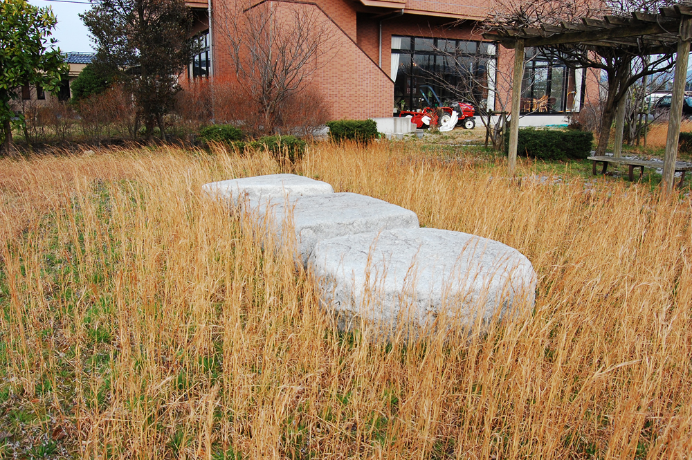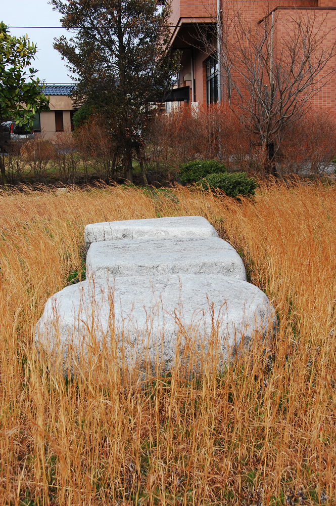 石はそれぞれ丸みを帯びていて、角がないので優しさを感じる。石の間隔は、丸・四角間が約33㎝。四角・三角間は狭いところで約33㎝、広いところで約100㎝。と歩幅よりも少し広い感じはするが十分超えられる距離。それは、歩み寄っていけることを意味しているのだろうか。