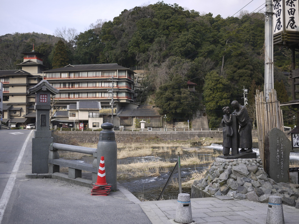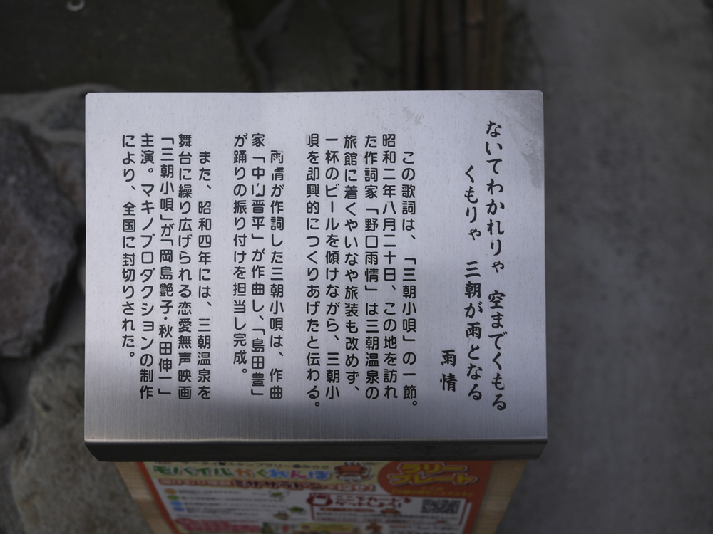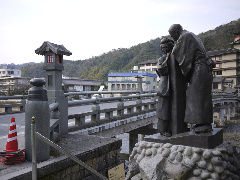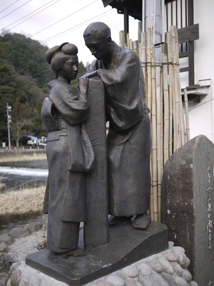 昭和の初めに作られたという恋愛無声映画「三朝小唄」の一場面であろうか。この映画によって全国に広く三朝の名が広まることになったという。橋の柱付近でこれから別れることになる男女の姿なのか、その表情は憂いを帯びている。周囲をぐるっと廻ってみたがこのブロンズ作品の作者や建立された時期などを見つけることはできなかった。この作品をバックに写真を撮る観光客の姿がたくさん見られた。