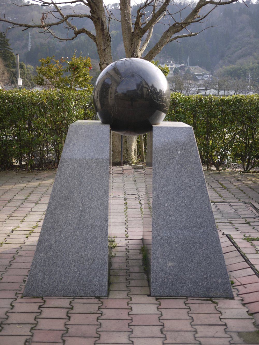 ラジウムの発見者キューリー夫人にちなみ、世界屈指のラジウム温泉を誇る三朝町とフランスのラマルー・レ・パン町と友好を象徴した広場に建つ記念碑。黒御影石の球の表面には地球の陸地部分が刻まれて、地球にみたてられている。その球は2本の柱で支えられるようにして浮いている。