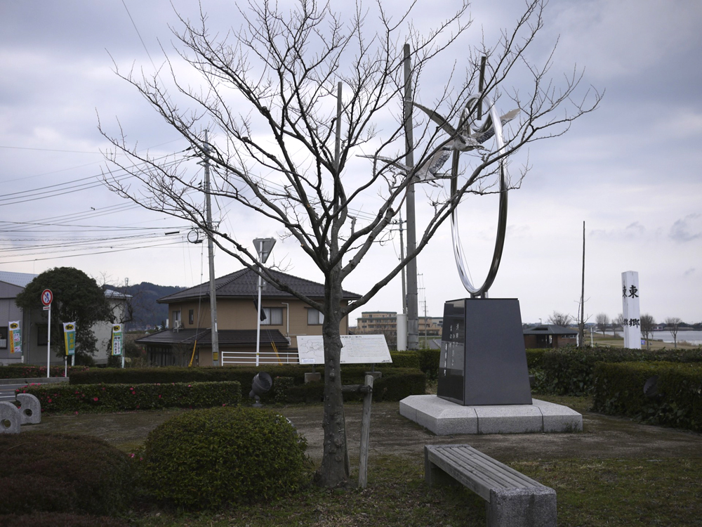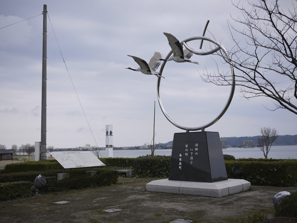 道路沿い、右に向かってカーブしている先に設置されている。その後ろには東郷湖を望むロケーション。周りにはベンチが置かれている。芝生がしきつめられた公園の一角。湖には鳥も数羽、羽を休めている姿もみられる。