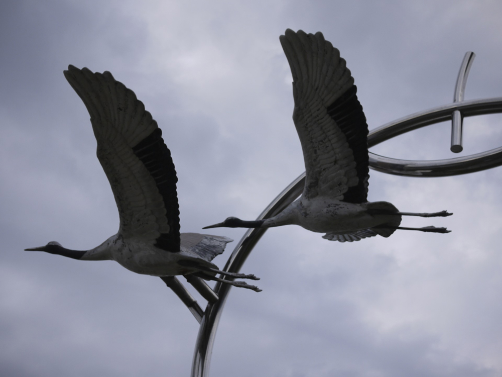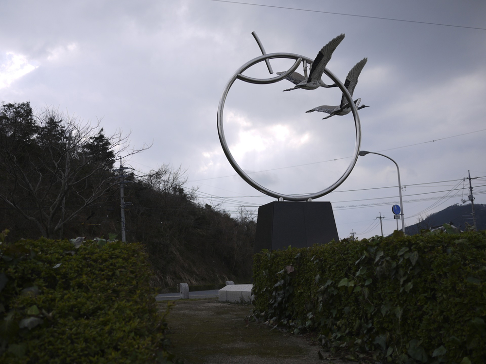 金属部分は梨の果実の輪郭を描き、その手前を水鳥が二羽天へ向かって羽ばたいている。水鳥の部分はおそらくFRPかモルタルのような素材で作られていると思われるが、着色も実物のようになされている。背後には東郷湖の雄大な光景が広がる。おそらく季節ごと、時間ごとによってさまざまに変化する情景と合わせて作品を楽しむことができる。梨の部分が輪郭となっているのはきっと、背後の美しい情景を見せたいからであろう。
