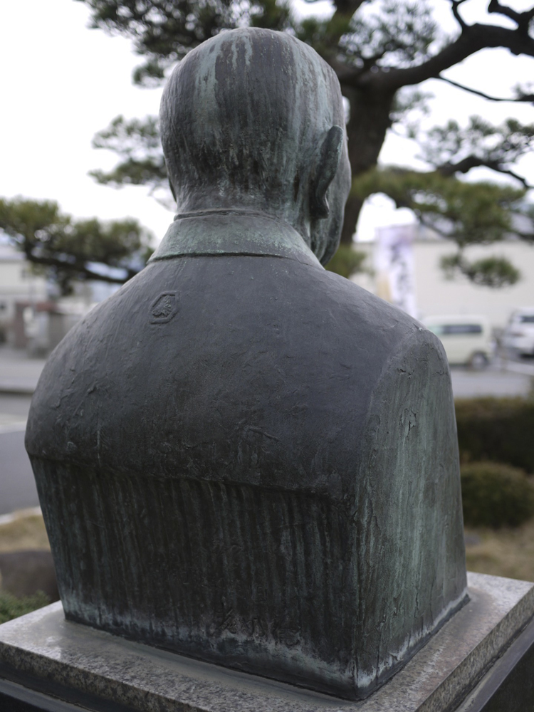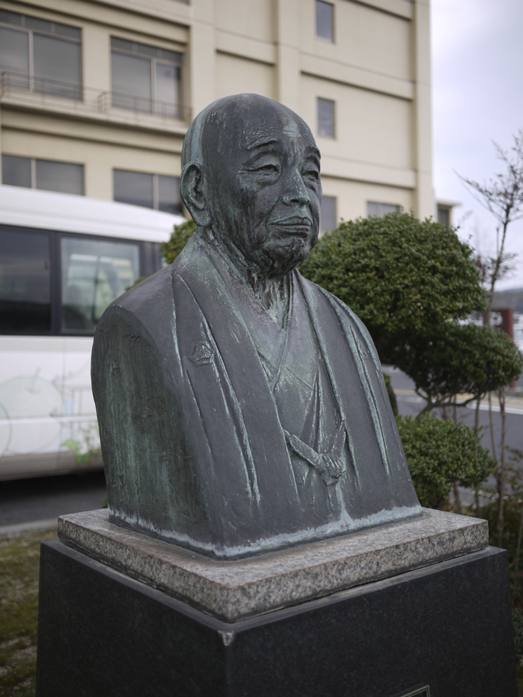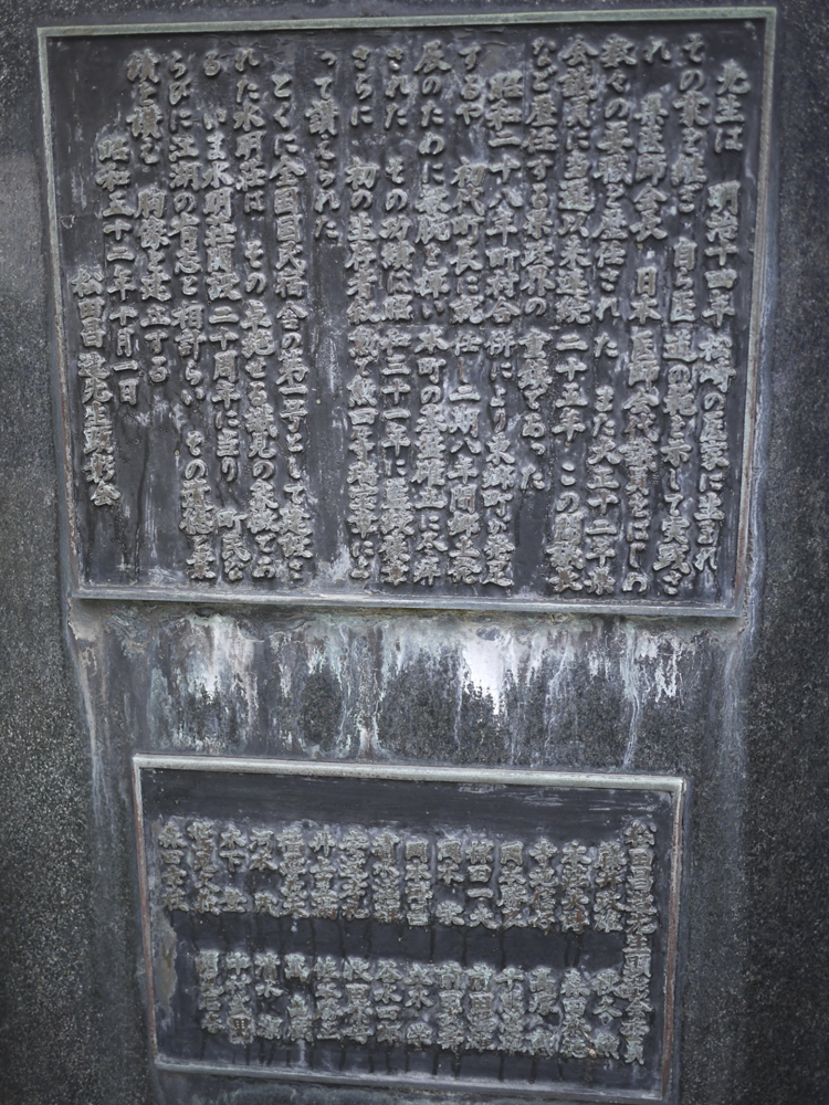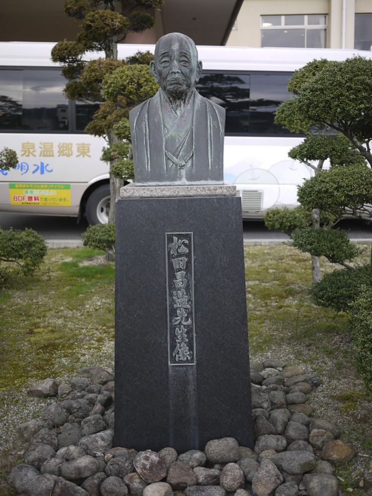 松田昌造氏(1881~1964)はこの東郷の地に医師の家に生まれ、自らも医師として、また政治家としても県会議員・町長等の役職で活躍し、地元に貢献した人物。国民宿舎水明荘は全国第一号として建設されたが、それにあたっても尽力し、顕彰されている。周りの植え込み等もしっかりと手入れされておりすっきりとした中に作品は設置されている。