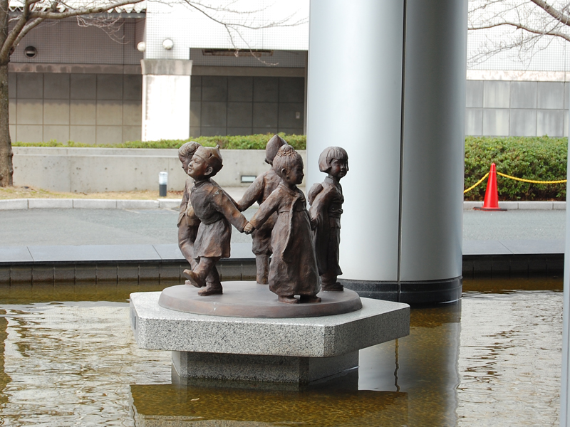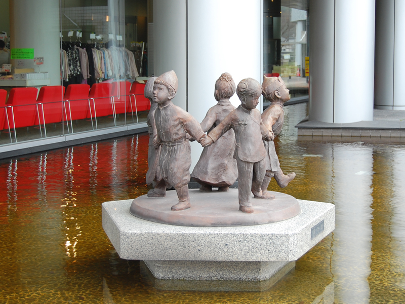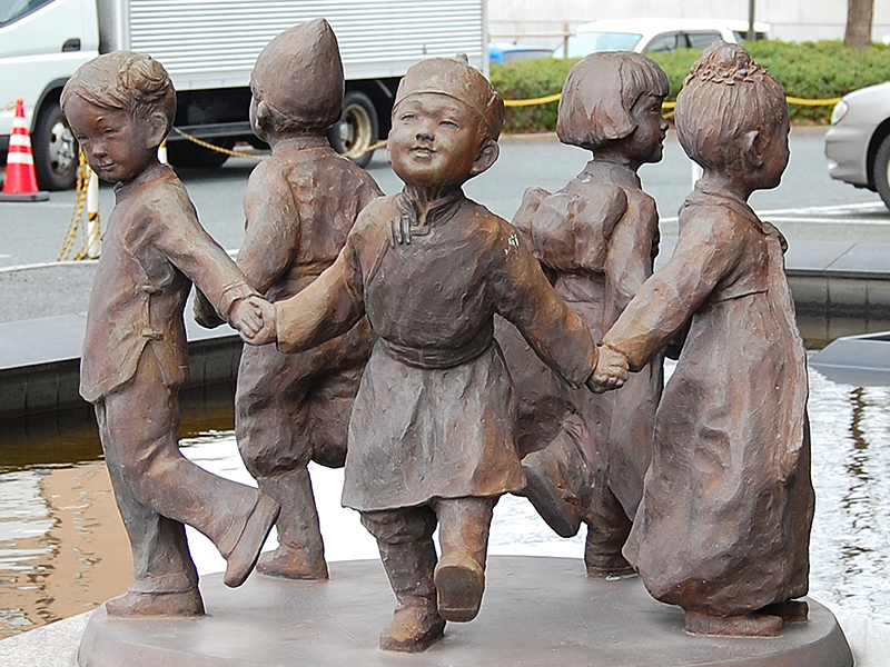 東アジア国々の民族衣装を着た子どもたちが、笑顔で手をつなぎ輪を作っている。