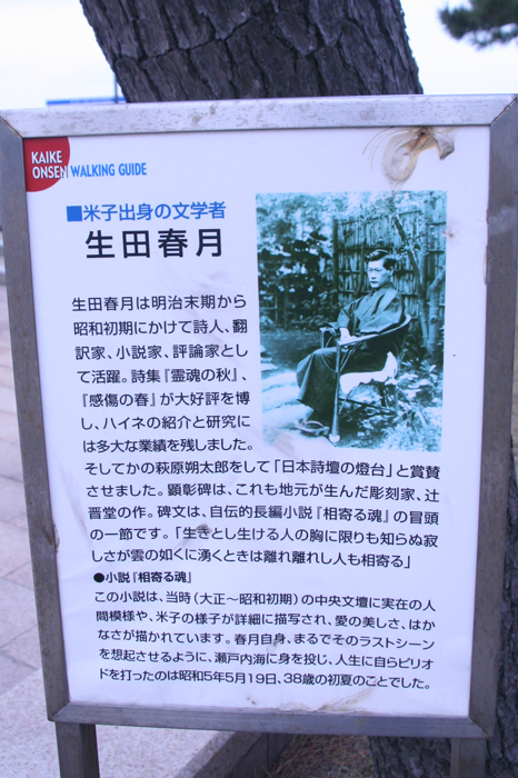 皆生海岸が生田春月の自伝的小説「相ひ寄る魂」に登場する「浜灘」にあたるため設置された。