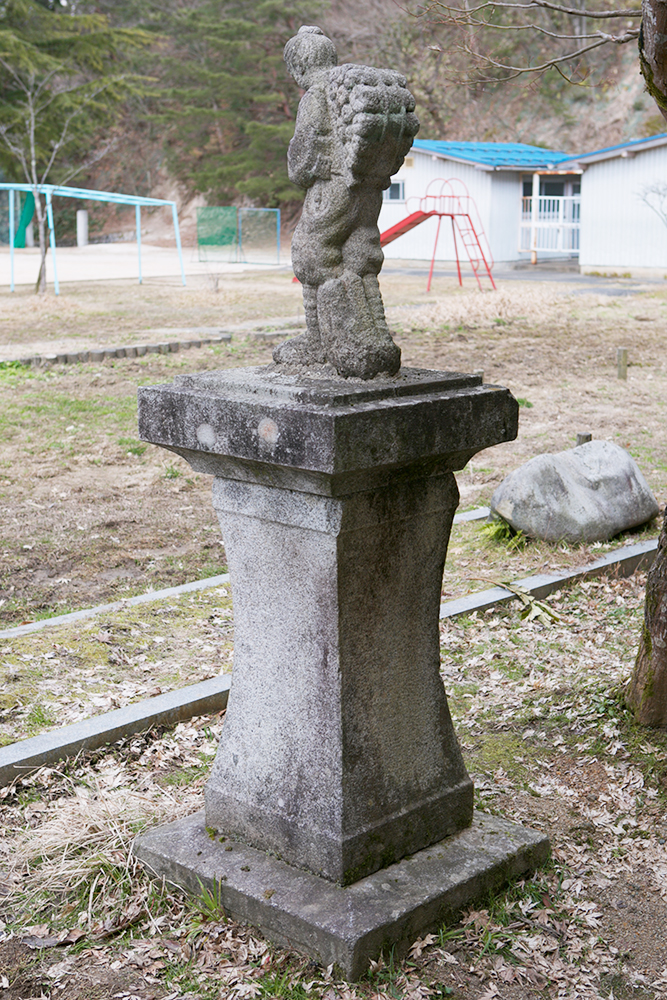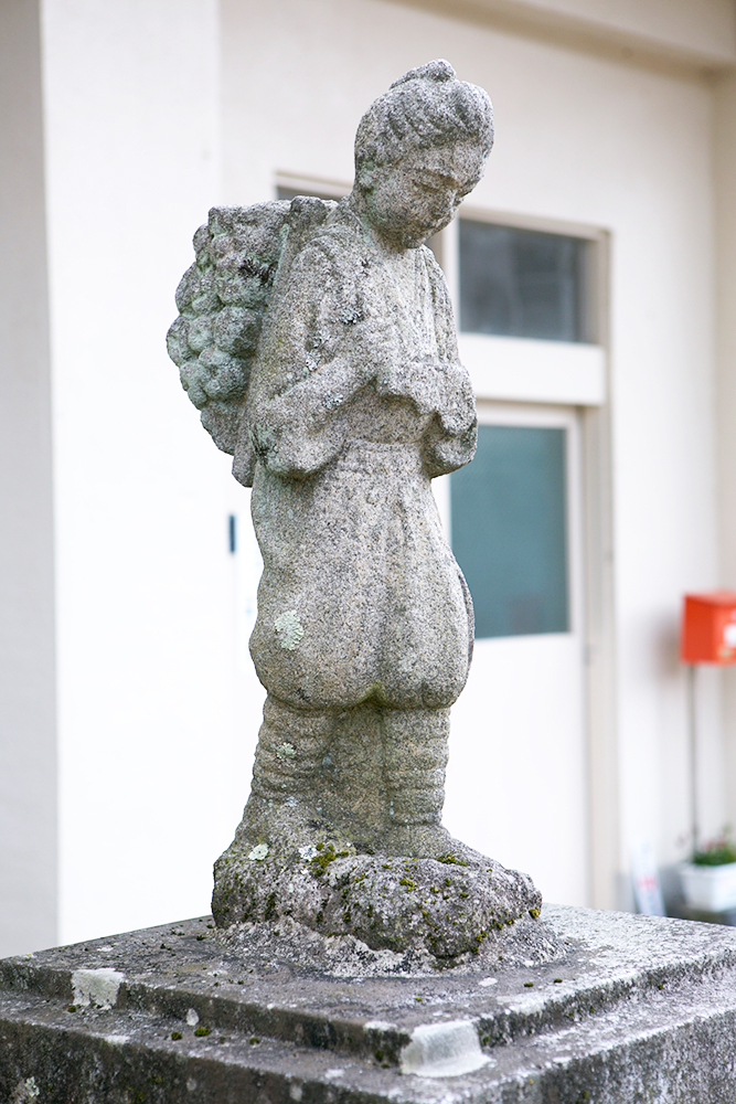 左足を一歩前に出し、歩む像である。左手のおそらく本を持っている部分が破損しているようである。