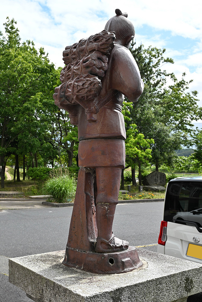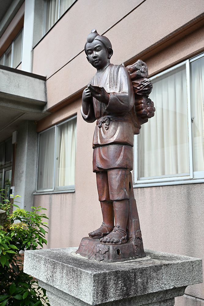 白御影石の台座の上に立つ。背負子の芝を担ぎ左手に開いた本を持ち左足を一歩前に出し、歩む像である。腰に印籠を持つ。像は腰の位置で上下に分かれる造りである。短めのズボン、素足に草履を履く。本焼きの割れ防止のためか数箇所に丸い穴が認められる。本の一部に破損が見られる。台座に至誠勤労分度推譲の報徳思想の文字が彫られている。