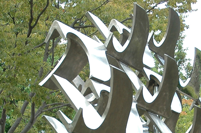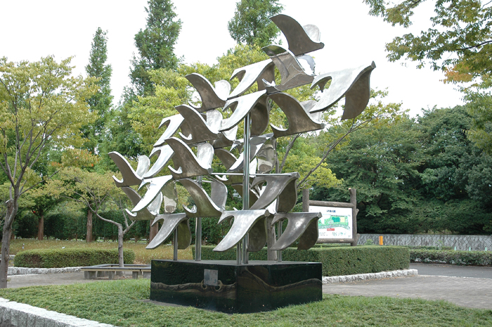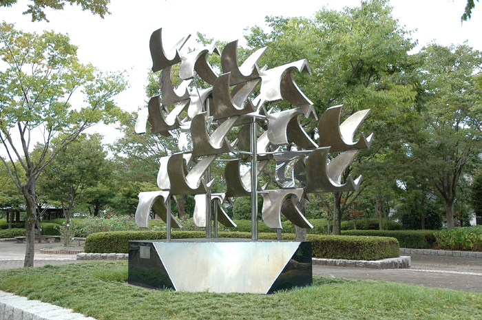 デザイン的に処理された鳥の群である。羽の状態や表面に艶のある鳥,ない鳥などの対比が印象深い。表面が磨かれた台座には,その周りの植物が反射して写っている。また台座の部分的にカットされた所には空が反射して写り,空の中を鳥の群が飛んでいるかのように思わせ,引き立てている。