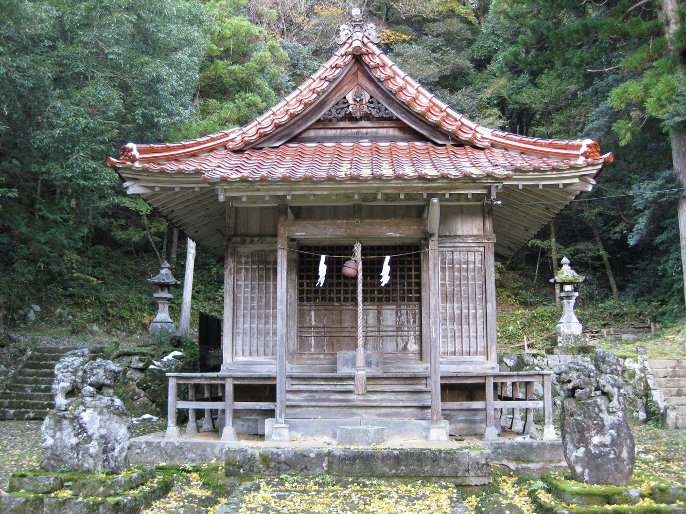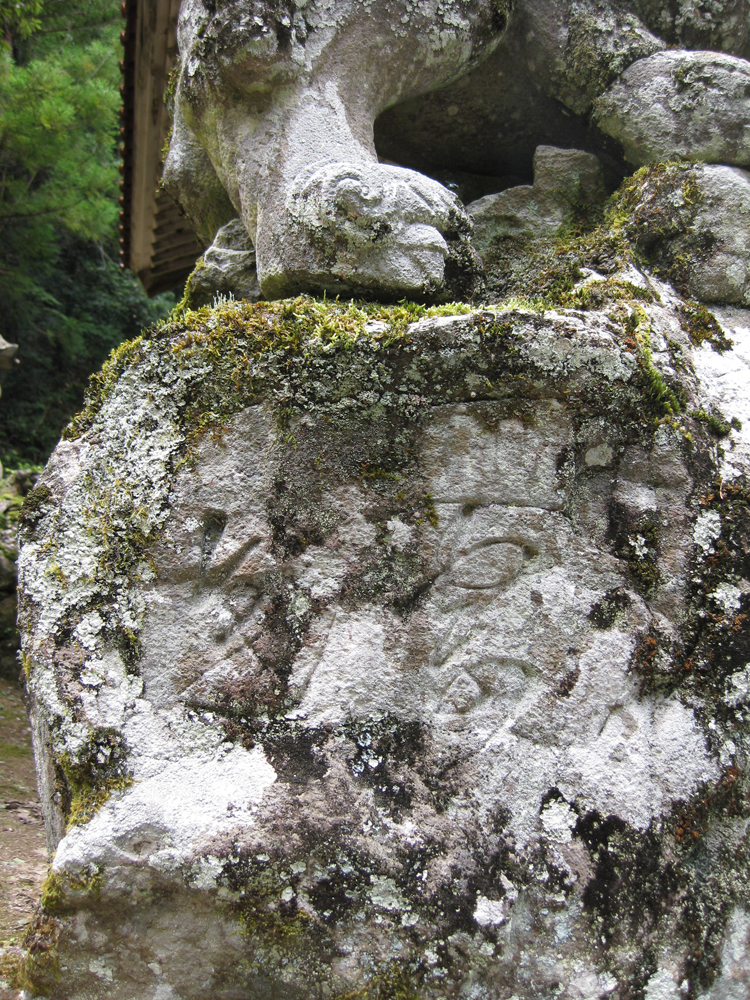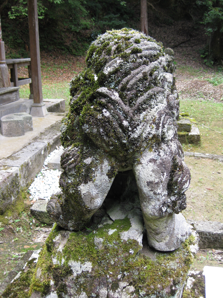 こちらも自然石の台座のかたちを活かして、岩に登るように狛犬は構えているが、“うん像”であるので口を閉じ、伏せたような姿勢をしているので静的な印象を受ける。支えのためか、あごの部分に石が入れられている。