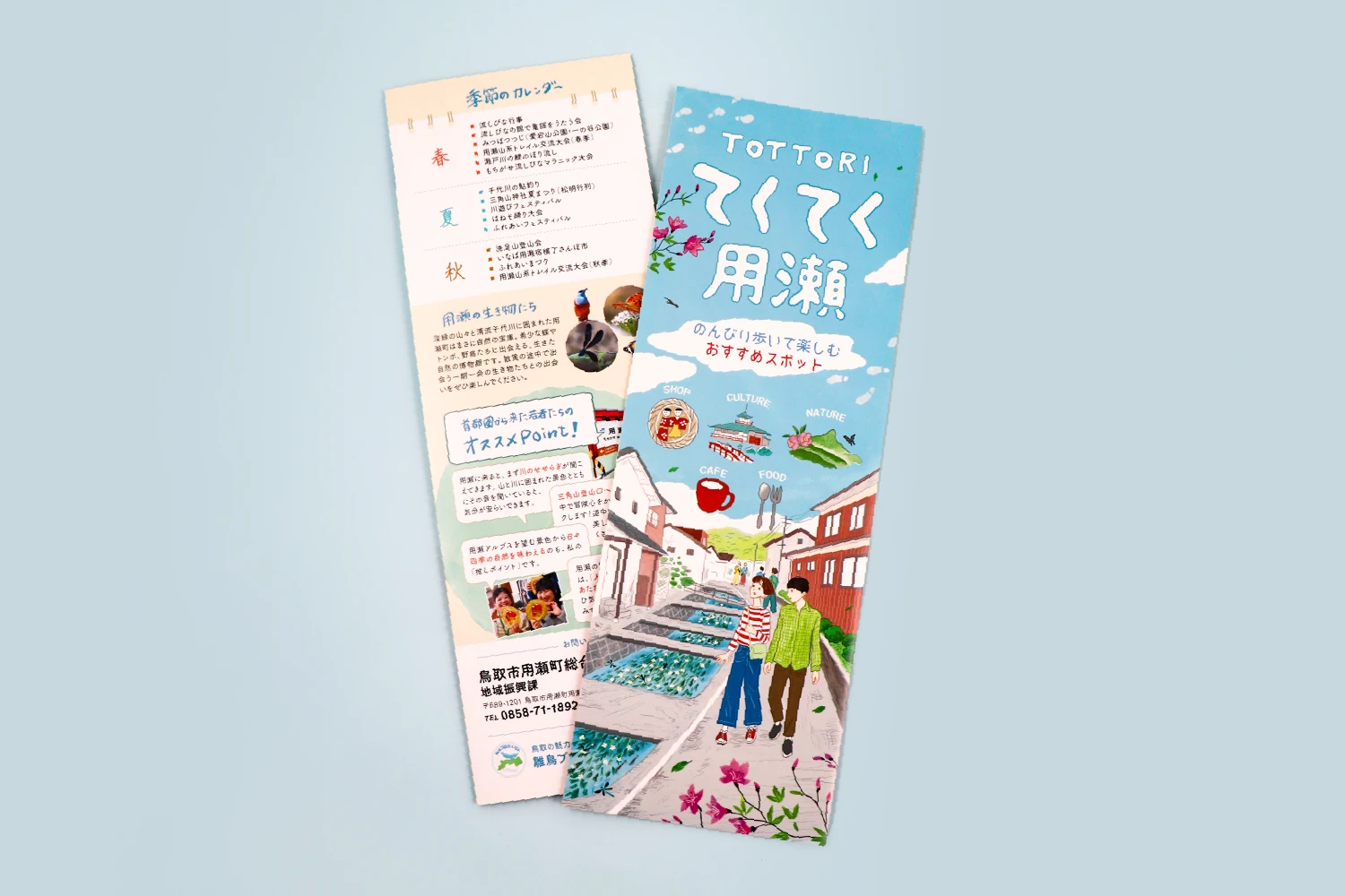歴史ある町並みや流しびなの文化、自然豊かな景色、地元で愛される飲食店やショップなど、“のんびり歩いて楽しめるまち・用瀬” の魅力が伝わるマップとなりました。