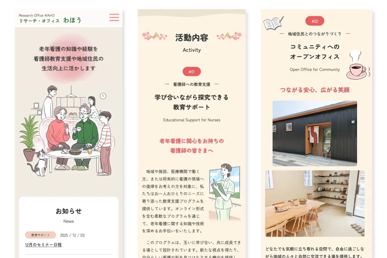 「老年看護」に長年携わってこられた坂口さまが、これまで培われた知識と経験を地域や次世代の育成に活かすために設立された “リサーチ・オフィス わほう”。